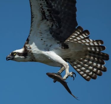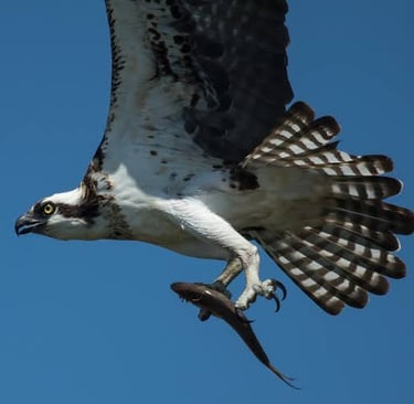 El águila pescadora (Pandion haliaetus) es una rapaz de tamaño mediano, ampliamente distribuida en todo el mundo. Es conocida por su habilidad excepcional para cazar peces, los cuales constituyen la mayor parte de su dieta. Habita en zonas cercanas a cuerpos de agua como lagos, ríos y costas. Su vuelo es potente y preciso, y puede sumergirse en el agua para capturar a sus presas con sus afiladas garras. Es una especie migratoria, desplazándose largas distancias entre sus áreas de cría y de invernada.