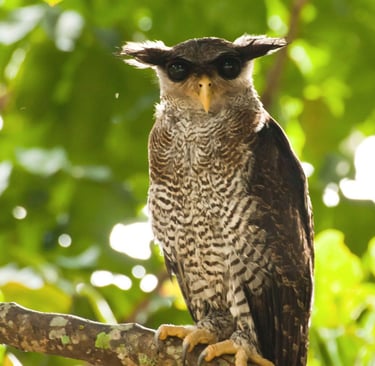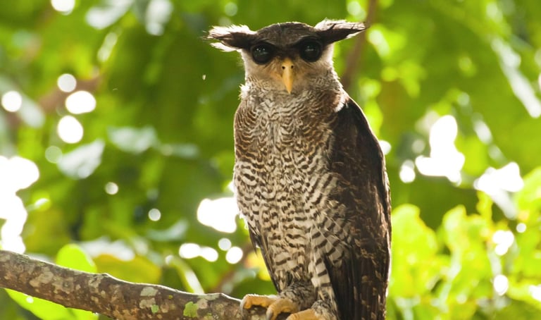 El búho malayo (Bubo sumatranus) es una impresionante ave rapaz nocturna que habita en los bosques tropicales del sudeste asiático, especialmente en Malasia, Sumatra y Borneo. Su plumaje oscuro, con patrones moteados, y sus penetrantes ojos amarillos lo convierten en un depredador eficaz y sigiloso. Se alimenta de pequeños mamíferos, aves e insectos, cazando en la noche gracias a su aguda visión y oído. Prefiere áreas forestales densas, aunque puede adaptarse a hábitats modificados por el ser humano. Este búho es un símbolo de la biodiversidad de las selvas asiáticas y un indicador de su conservación.