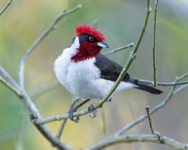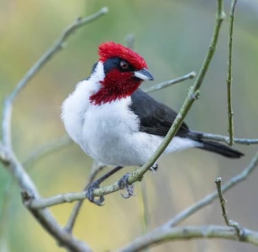 El Cardenal Enmascarado es un ave paseriforme de gran belleza, nativa de América del Sur. Se caracteriza por su llamativo plumaje tricolor: rojo intenso en la cabeza y pecho, negro en el rostro y alas, y blanco en el vientre. Es una especie sociable que habita en bosques, matorrales y sabanas, cerca de fuentes de agua. Su canto es melodioso y se alimenta principalmente de insectos y frutas.