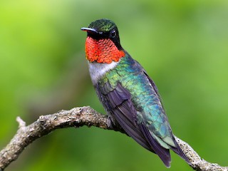El colibrí garganta de rubí (Archilochus colubris) es una pequeña ave migratoria de la familia Trochilidae, conocida por su velocidad y colores vibrantes. Los machos destacan por su iridiscente garganta roja, mientras que las hembras tienen tonos más apagados. Habita en bosques, jardines y campos de América del Norte, migrando a América Central durante el invierno. Se alimenta principalmente de néctar, complementando su dieta con pequeños insectos y arañas. Su capacidad para batir las alas hasta 80 veces por segundo lo convierte en un polinizador crucial en los ecosistemas.