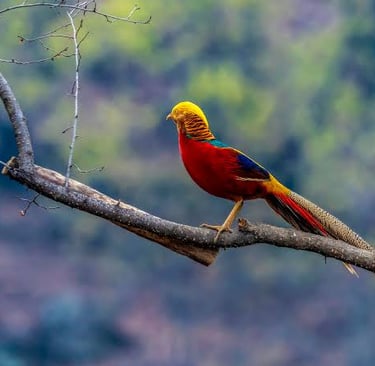 El faisán dorado es una especie de ave galliforme originaria de Asia, famosa por el plumaje exuberante y colorido del macho. Su cresta dorada, su cuerpo rojo intenso y su larga cola adornada lo convierten en una de las aves más bellas del mundo. Estos faisanes habitan en bosques y matorrales, y se alimentan principalmente de semillas, frutas y pequeños invertebrados. Las hembras, con un plumaje más discreto, se encargan de incubar los huevos y cuidar de las crías.