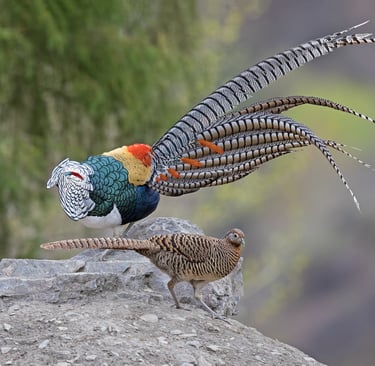 El faisán Lady Amherst (Chrysolophus amherstiae) es un ave exótica originaria de las montañas del suroeste de China y Birmania, conocida por su plumaje deslumbrante. Los machos presentan una combinación espectacular de colores, con una capa blanca y negra en la cabeza, un pecho verde iridiscente y largas plumas de la cola adornadas con patrones intrincados. Esta especie es tímida y prefiere los bosques densos y los matorrales altos, donde se alimenta de semillas, frutas e insectos. Su elegancia lo hace popular en aviarios, aunque en la naturaleza su hábitat está en declive. El faisán Lady Amherst es un símbolo de belleza y diversidad en el reino animal.