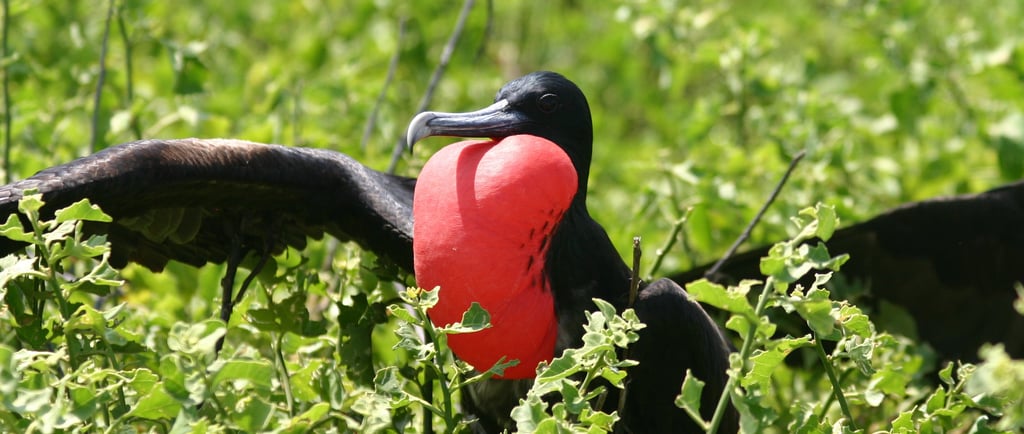 El ave fragata real es un espectáculo de la naturaleza. Con su enorme envergadura y su cola profundamente bifurcada, es un ágil planeador de los océanos tropicales. Los machos son especialmente llamativos gracias a su gran bolsa gular roja inflable que utilizan para atraer a las hembras durante el cortejo. Una característica peculiar de esta especie es su hábito de robar alimento a otras aves marinas.