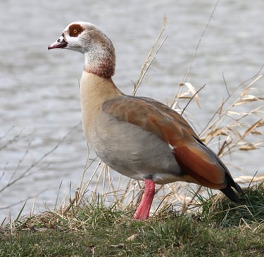 El ganso egipcio es un ave originaria de África, pero que se ha introducido en otras partes del mundo. Se caracteriza por su plumaje marrón, manchas castañas alrededor de los ojos y un parche marrón en el pecho. Es un ave sociable que suele vivir en parejas o grupos. Aunque es herbívoro, también puede consumir pequeños animales. En algunas regiones se considera una especie invasora debido a su rápida adaptación y competencia con otras aves locales.