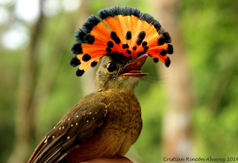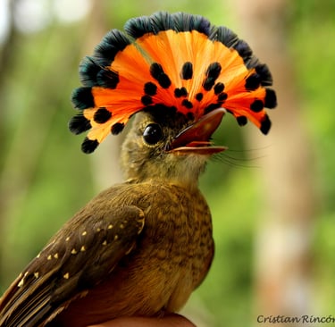 El mosquero real (Onychorhynchus coronatus) es un ave llamativa de la familia Tyrannidae, distribuida en los bosques tropicales de América Central y del Sur. Su rasgo más característico es su cresta en forma de abanico, de colores vibrantes como rojo, naranja y amarillo, que despliega en momentos de cortejo o alarma. De hábitos insectívoros, se alimenta principalmente de pequeños insectos que captura al vuelo. Prefiere hábitats densos y húmedos, como selvas y bordes de ríos, donde permanece discretamente entre la vegetación. Es una especie que simboliza la riqueza y diversidad de los ecosistemas tropicales.