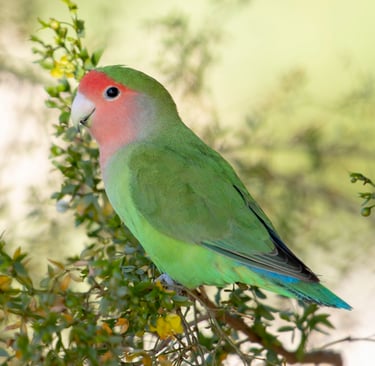 El periquito de Namibia es un pequeño loro muy colorido, originario de las zonas áridas del suroeste de África. Destaca por su plumaje verde brillante y su cabeza de color rosa o salmón. Es un ave sociable que vive en grupos y anida en cavidades, a menudo en colonias de otras aves. Su dieta se basa principalmente en semillas y frutas. Debido a su belleza, es una especie popular en el comercio de mascotas, lo que ha llevado a una disminución de sus poblaciones silvestres en algunas áreas.