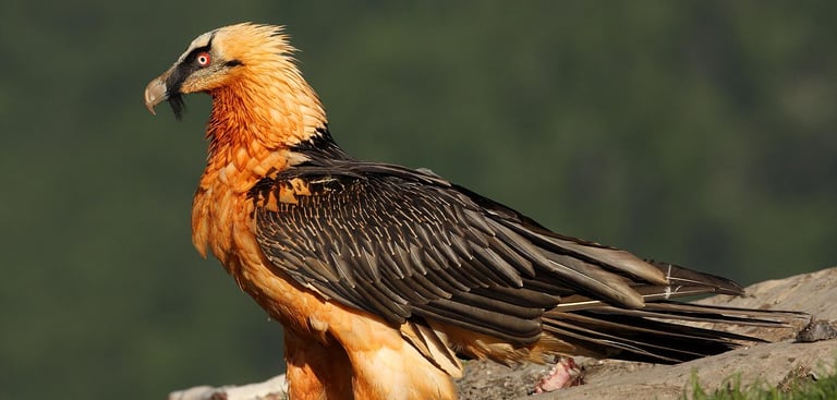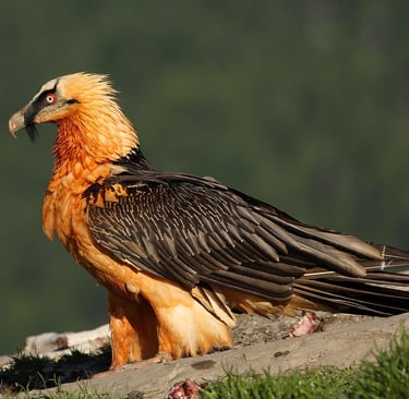 El quebrantahuesos es un imponente ave rapaz conocida por su extraordinario comportamiento alimenticio, ya que se alimenta principalmente de huesos, dejándolos caer desde gran altura para romperlos y acceder al tuétano. Su plumaje varía entre tonos dorados, negros y blancos, con un característico "maquillaje" rojo que adquiere de baños en suelos ricos en óxido de hierro. Habita en regiones montañosas de Europa, Asia y África, desempeñando un papel esencial como carroñero en su ecosistema. Es una de las aves más grandes con una envergadura que puede superar los 2,7 metros. Aunque se encuentra en peligro en algunas áreas debido a la caza, el envenenamiento y la pérdida de hábitat, los esfuerzos de conservación han ayudado a recuperar sus poblaciones en ciertos lugares.