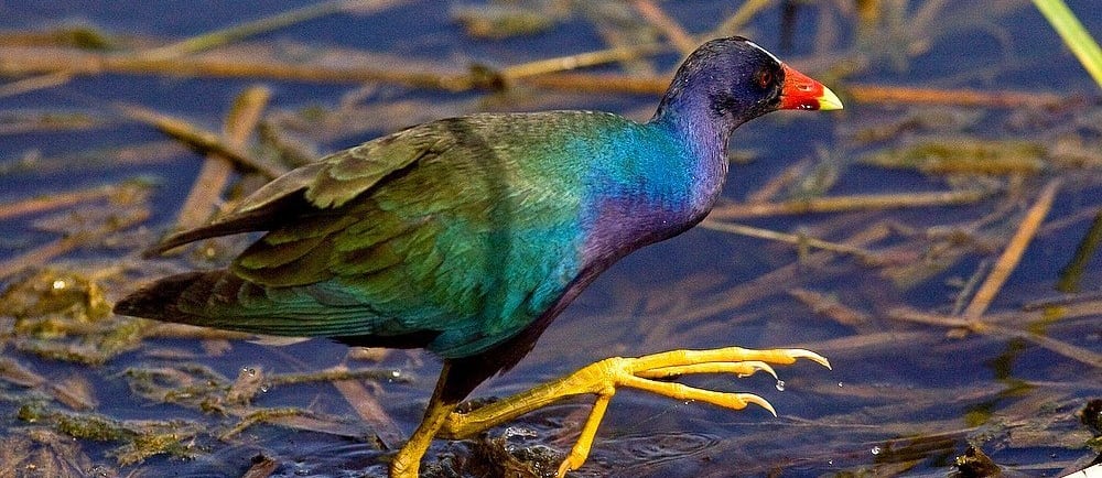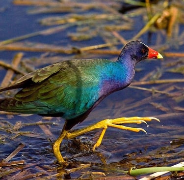 La tingua azul es un ave acuática elegante y llamativa, conocida por su plumaje azul vibrante, patas largas y tonos verdes iridiscentes en sus alas. Habita en humedales, lagunas y áreas pantanosas de América del Sur, incluyendo Colombia, donde es símbolo de la riqueza ecológica. Es una especie tímida pero ágil, que se desliza sobre la vegetación flotante en busca de alimentos como insectos y pequeños moluscos. Desempeña un papel crucial en los ecosistemas acuáticos, ayudando a controlar poblaciones de invertebrados. Sin embargo, la pérdida de hábitats y la contaminación amenazan su supervivencia, subrayando la importancia de conservar los humedales.
