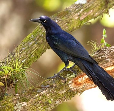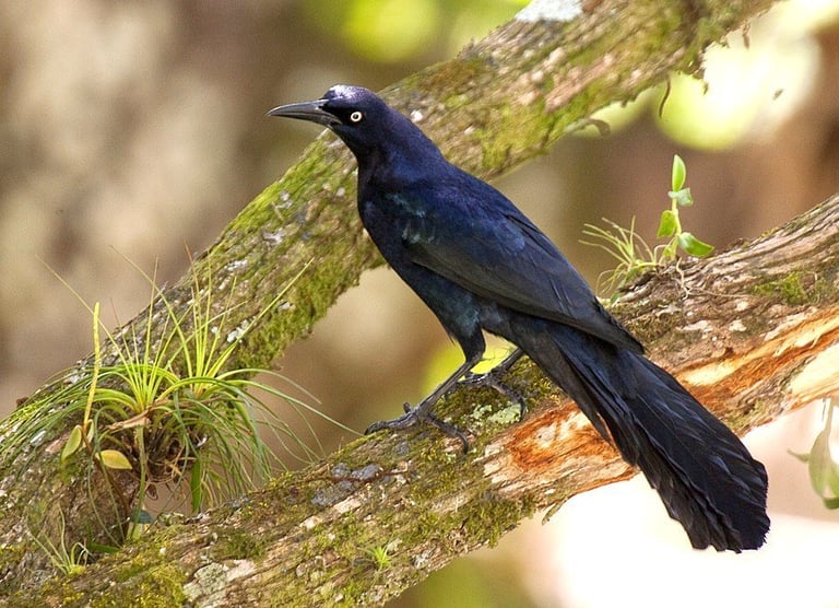 El zanate mexicano es un ave paseriforme de la familia Icteridae, conocida por su plumaje negro iridiscente y su cola larga. Es una especie gregaria que se encuentra en gran parte de América. Los machos son más grandes que las hembras y poseen un canto distintivo. Se alimentan de insectos, frutas y granos, y suelen formar grandes bandadas, especialmente en época de migración. A pesar de ser una especie común, el zanate mexicano ha sido objeto de estudio por su comportamiento social complejo y su adaptación a diversos hábitats.